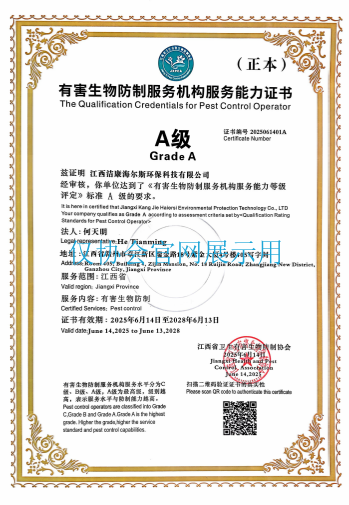 成立时间:洁康海尔斯公司创始于1998年,是专业从事有害生物管理 (PMP) 的机构, 公司本部位于江西赣州市,在南昌、吉安、新余、鹰潭、景德镇、宜春等城市均设有分公司,是目前在江西省最具规模的专业有害生物管理 (PMP) 企业。是中国卫生有害生物防制协会理事单位,江西省卫生有害生物防制协会副会长单位、江西省贵州商会常务副会长单位、南昌市卫生有害生物防制协会副会长单位,中国虫害管理联盟发起单位之一。是省内首批被评定为有害生物管理 (PMP) 国家 A 级资质企业,是省内首家在行业通过 ISO9001 质量管理体系、ISO14001 环境管理体系、ISO 职业健康管理体系认证的企业,先后荣获有害生物管理 (PMP) 工作先进单位、南昌市七城会 (PMP) 行业优质服务单位,江西省第十四届运动会病媒生物防制唯一供应商、峡江水利枢纽库区卫生清理及有害生物管理 (PMP) 工作唯一供应商,在江西省树立了有害生物管理 (PMP) 行业领航者的领先形象。 人员情况:公司拥有省内外经验丰富的专家 10 多名及 200 多名爱岗敬业,技术全面的 专业服务人员,业务遍及江西省各地市、及国内部分地区。并相继成立了赣州洁康海尔斯、南昌洁康海尔斯、景德镇洁康海尔斯、吉安、新余、鹰潭等公司。 目前公司拥有一批 100 多台专业设备及 30 多辆专用工程车。 取得成绩:近几年公司在创建国家级、省级卫生城县公共区域开展有害生物防治项目的相关的部分业绩如下所示: 赣州市创建省级卫生城市公共区域开展有害生物防治项目 泰和县创建省级卫生城县公共区域开展有害生物防治项目 安福县创建省级卫生城县公共区域开展有害生物防治项目 吉水县创建国家卫生城县公共区域开展有害生物防治项目 峡江县创建国家卫生城县公共区域开展有害生物防治项目 金溪县创建国家卫生县城公共区域开展有害生物防治项目 新干县创建国家卫生城县公共区域开展有害生物防治项目 上犹县创建省级卫生城县公共区域开展有害生物防治项目 遂川县创建省级卫生城县公共区域开展有害生物防治项目 永新县创建省级卫生城县公共区域开展有害生物防治项目 于都县创建省级卫生城县公共区域开展有害生物防治项目 景德镇市创建国家卫生城县公共区域开展有害生物防治项目