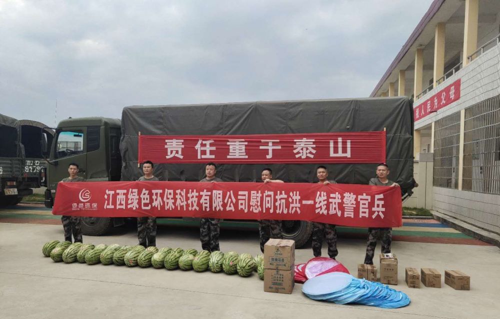 兵不远千里奔赴抗洪救灾第一线日夜奋战在沿江大堤上。江西省卫生有害生物防制协会会员单位—江西绿色环保科技有限公司冒着酷暑将慰问品送到子弟