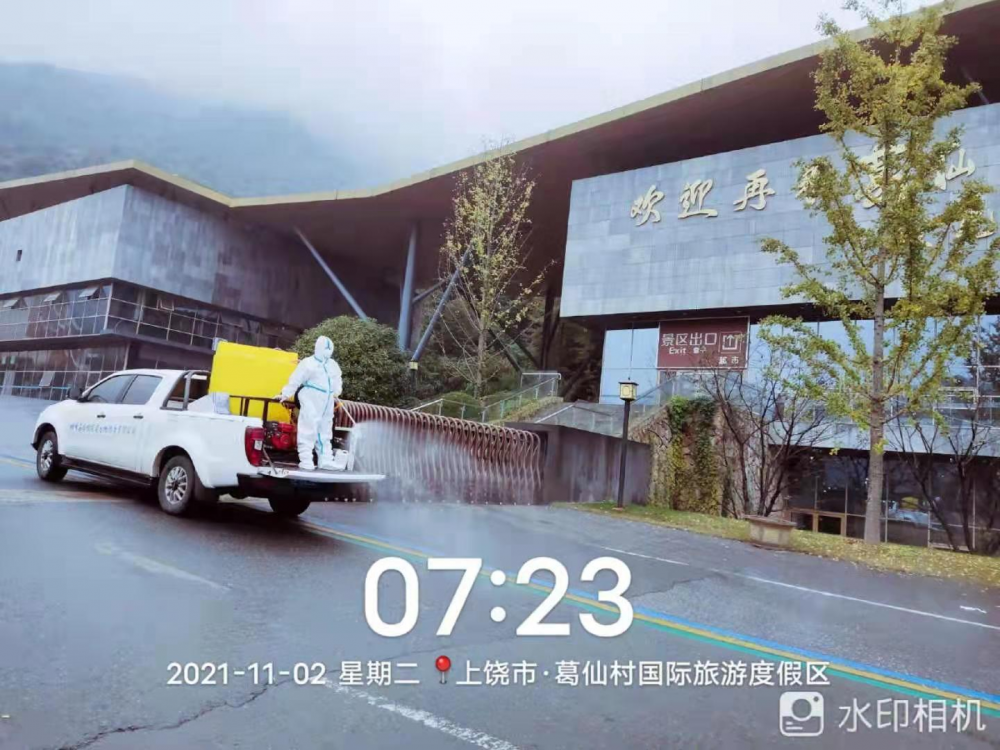 队员们无惧无畏始终奋战在疫情发生的中心地带葛仙村国际旅游度假区开展消毒工作。