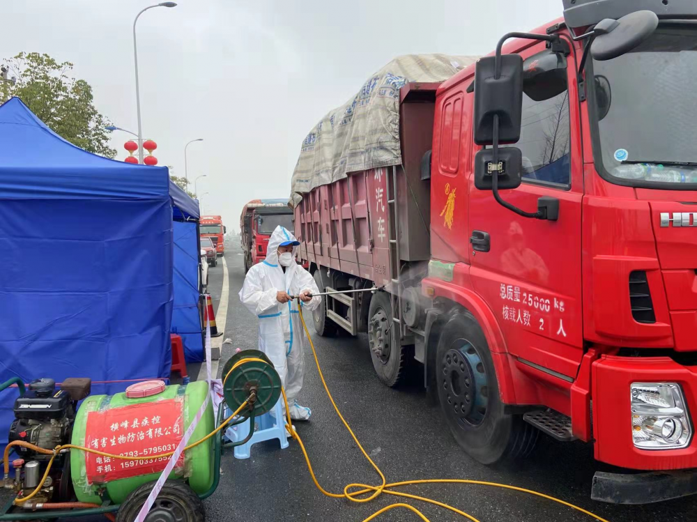 队员们按照有关部门要求,在高速路口设置消毒点二十四小时不间断地对来往车辆进行消毒工作。