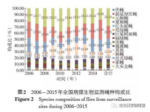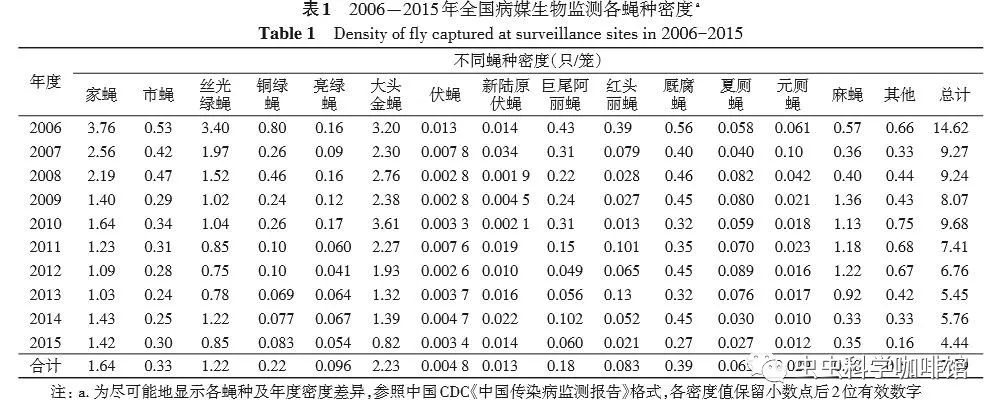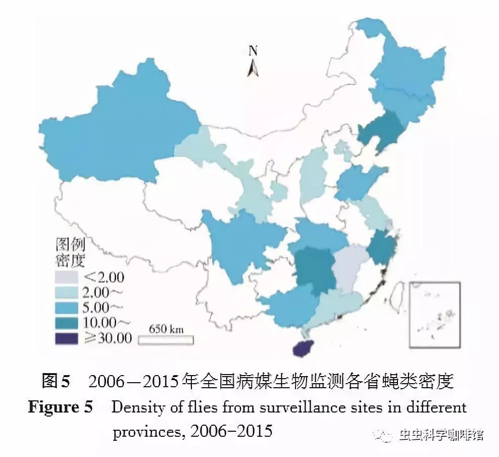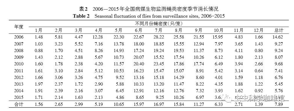 2005年中国CDC启动了全国重点传染病及病媒生物监测项目,其中病媒生物监测按照 《全国病媒生物监测方案(试行)》,主要在人居及周边环境进行蚊、蝇、鼠和蜚蠊4类重要病媒生物的密度监测,2016年全国病媒生物监测启用新方案。为了解我国人居及周边环境常见的蝇种、密度及其季节消长规律,为科学监测和蝇类的防控提供依据,现将2006-2015年)全国蝇类监测结果报告如下: