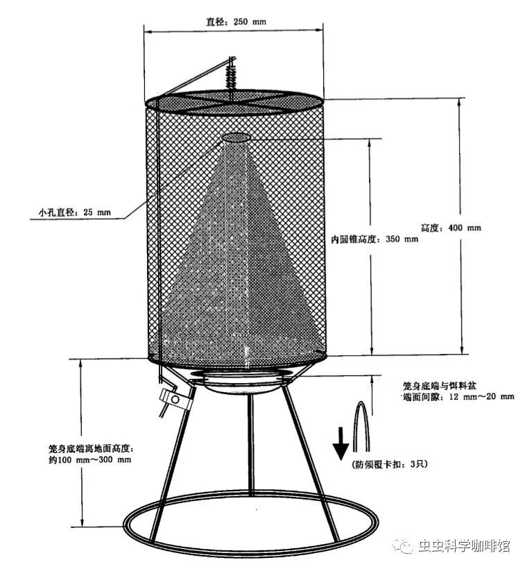 由防雨盖( 罩) 、笼骨、外丝网、内丝网、 诱饵托盘和固定支杆( 基座) 六大部件构成,是根据蝇类追香逐臭、趋光性和向上飞行、停栖在绳索上的 生活习性,专门设计的用于诱蝇、灭蝇的器具。