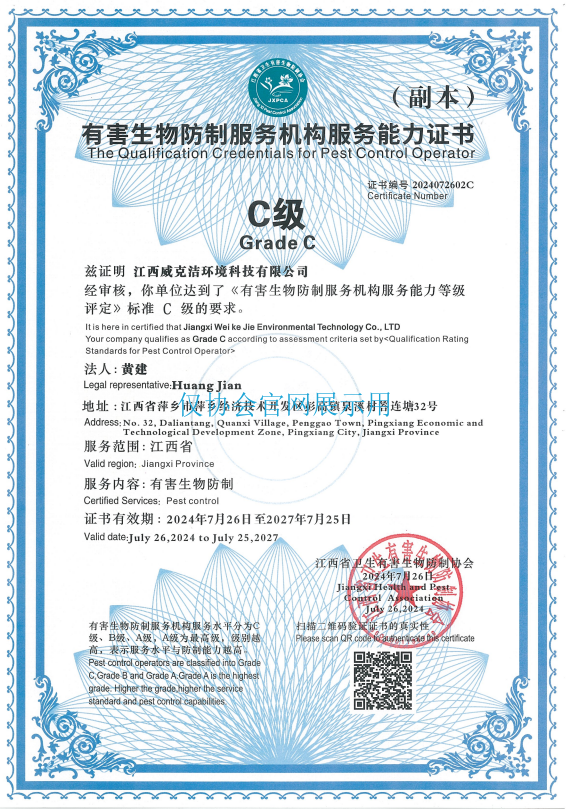 经营范围:除虫灭鼠 白蚁防治 有害生物防治 有害生物密度监测 公共环境消毒杀菌 林业有害生物防治 环境保护监测 病媒生物密度控制水平评价服务。