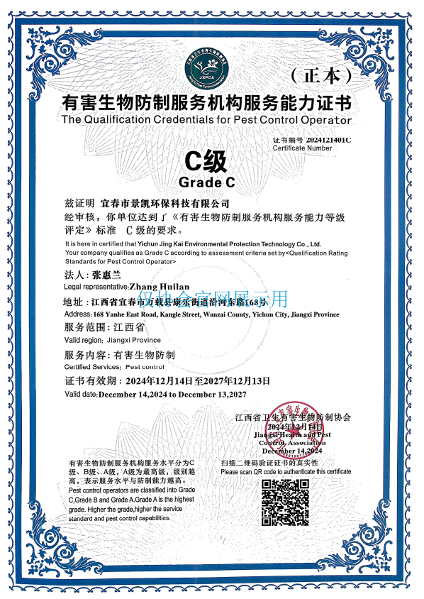 经营范围:一般项目:室内空气污染治理,环保咨询服务,环境应急治理服务,白蚁防治服务,家政服务,专业保洁、清洗、消毒服务,卫生用杀虫剂销售,污水处理及其再生利用,技术服务、技术开发、技术咨询、技术交流、技术转让、技术推广,林业有害生物防治服务,病媒生物防制服务,农作物病虫害防治服务,病媒生物密度监测评价服务,病媒生物密度控制水平评价服务,农业面源和重金属污染防治技术服务(除依法须经批准的项目外,凭营业执照依法自主开展经营活动)