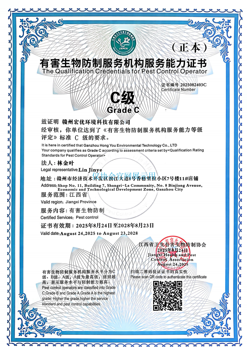 成立时间:2023年11月6日 人员情况:在职人员6人 经营范围:一般项目:白蚁防治服务,林业有害生物防治服务,病媒生物防制服务,专业保洁、清洗、消毒服务,室内空气污染治理,卫生用杀虫剂销售,环境卫生管理(不含环境质量监测,污染源检查,城市生活垃圾,建筑取圾,厨房垃圾的处置服务),环境保护监测(除依法须经批准的项目外,凭营业执照依法自主开展经营活动) 取得成绩:承接赣州市中小学及事业单位的病媒生物防治